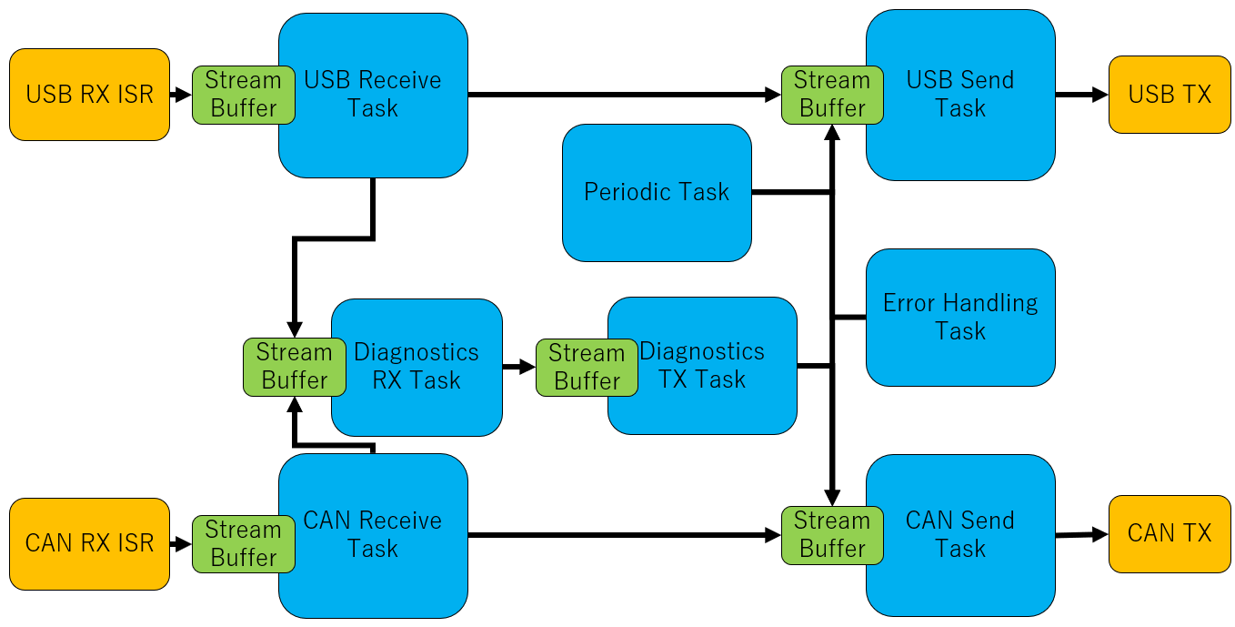 - CAN 发送任务,负责发送通过 流缓冲区请求的 CAN 消息。任何需要通过 CAN 进行通信的任务均可请求发送消息。