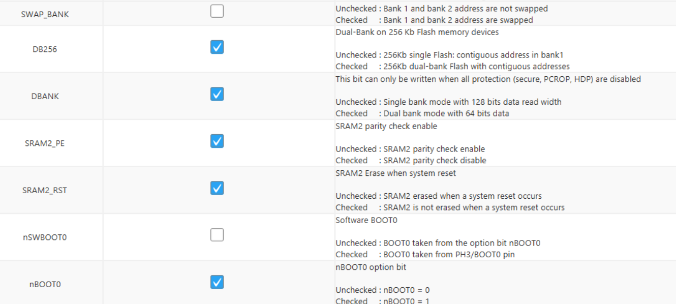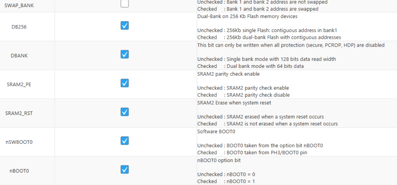 如果您在重新编程或调试 RAMN 时遇到困难,请使用STM32CubeProgrammer确保选项字节如下所示。