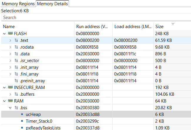 INSECURE_RAM 设置了“NOLOAD”参数,这意味着您在声明时无法对其进行初始化(例如,如果您写入 __attribute__ ((section (".buffers"))) uint8_t example = 1 ,example 将不会保存 1,而是会保存启动时内存中的任意值)。您可以通过移除 (NOLOAD) 来禁用此行为,具体操作是在 STM32L552CETX_FLASH.ld 中进行,但这样会导致生成非常大的 .bin 文件。