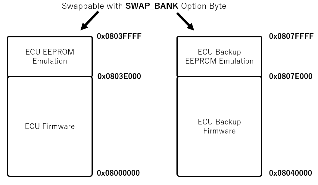 当通过 UDS 对 ECU 进行重新编程时( 而非通过其他接口 ),ECU 实际上会将新固件以及当前的 EEPROM 复制到非活动存储区。一旦复制完成,ECU 将切换 SWAP_BANK 选项字节,以交换两个存储区,从而有效地更新 ECU 正在运行的固件。