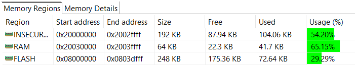 如果您不打算使用任何内存保护功能,您可以(也应当)将 STM32L552CETX_FLASH.ld 的内容替换为 STM32L552CETX_FLASH_INSECURE.ld ,这样在编译时仅会定义一个较大的 256kB RAM 区域(被认为不安全)。