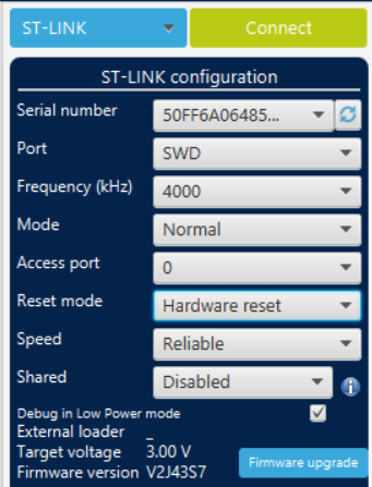 在STM32CubeProgrammer中启动,从右上角菜单中选择“ST-LINK”,然后点击“连接”。您可能会首先收到调试器固件更新的提示。如果连接失败,请尝试使用与下方截图中相同的设置。此外,还可以先将“共享:启用”设置为启用状态,然后再点击串口下拉框旁边的刷新(🔁)按钮。