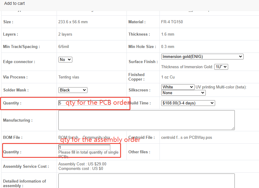 PCBWay 订购系统可能会显示必须订购 5 个或更多 RAMN;然而,只有(裸)PCB 才需要至少订购 5 个。您可以仅订购 1 块组装好的主板和/或扩展面板。如果您只需 1 个 RAMN,可以在 PCB 数量中设置为“5”,在组装数量中设置为“1”,如下面截图所示。