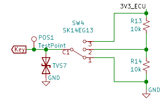 钥匙的旋转会从分压器中选择一个点(位置 1 -> 0V,位置 2 -> 1.65V,位置 3 -> 3.3V),该电压由 ECU 上的 ADC 进行测量。由于预计用户会操作该钥匙,因此使用了 TVS 二极管进行 ESD 防护。