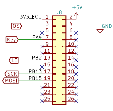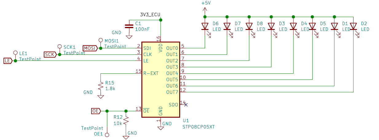 输出使能(OE)引脚被拉低,因此 STP08CP05 从上电时即处于激活状态,这可能会导致上电时出现轻微闪烁。与 ECU 失去一个 GPIO 相比,这种行为更为可取。