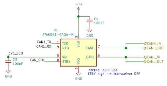 所有 ECU 均采用相同的 CAN-FD 物理层(PHY)设计,该设计基于一款简单的 CAN-FD 收发器 IC,并辅以旁路电容。该收发器从 5V 电源线(VDD)获取供电,但通信时使用 3.3V 电压(Vio)。