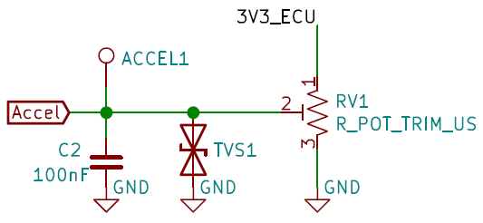 加速器由一个滑动电位器模拟实现。采用 TVS 二极管进行 ESD 防护,同时使用电容保护 ECU 输入端免受抖动干扰。