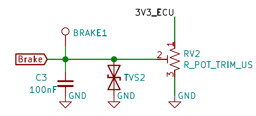 制动器同样由一个滑动电位器模拟实现,其电路与加速器相同。采用 TVS 二极管进行 ESD 防护,同时使用电容保护 ECU 输入端免受抖动干扰。