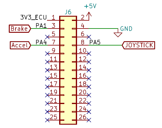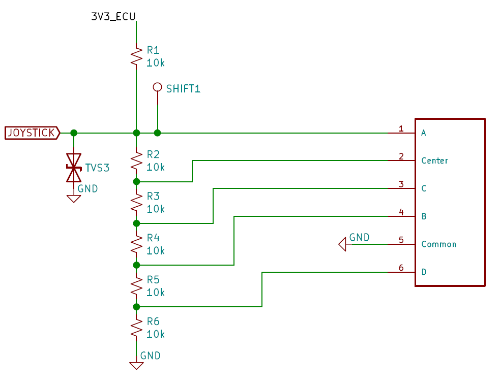 操纵杆的运动从分压器中选择一个点,该点电压由 ECU 上的 ADC 进行测量。此外,还使用了 TVS 二极管进行 ESD 防护。