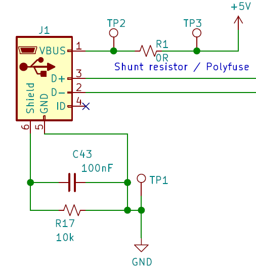 USB 连接电路仅在 SHIELD 和 GROUND 之间配置了一个 RC 滤波器。可以使用分流电阻进行简单的功率分析。此外,也可以用聚合物保险丝替代分流电阻。
