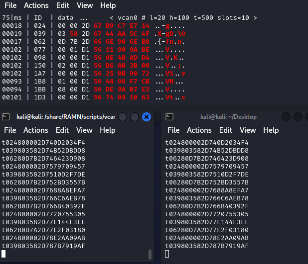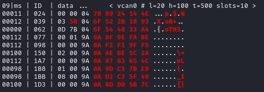 您可以通过编辑 scripts/settings/linux.ini 中的 VCAND_HARDWARE_PORT(默认:自动检测)或使用-r 选项来选择 RAMN 使用的串口。之后,您应该能够在 vcan0 上看到 RAMN 的 CAN 流量,例如通过以下命令: