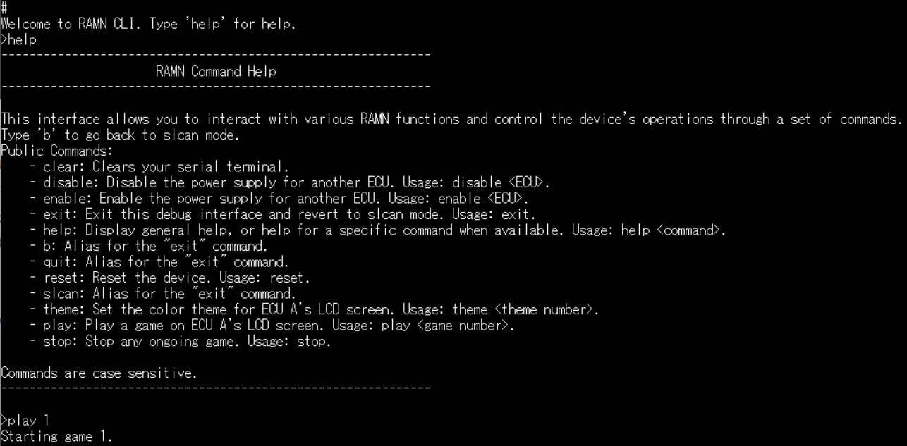 c 命令(使用 c0 启用或 c1 禁用)用于将设备激活为“CARLA”模式,在此模式下,设备会通过串行数据包定期向驾驶模拟器更新 CAN 总线状态。u 命令是一个更新命令,用于同步驾驶模拟器与 RAMN 板。w 命令用于在不打开 slcan 端口的情况下应用新的 CAN 外设设置。RAMN 的命令行界面 (CLI) 提供了与通过 CAN 接口相同的自定义功能,但以更加友好的方式呈现。只需输入 # 自定义 slcan 命令即可打开它。然后,您可以输入常规命令,例如“help”以显示帮助页面。