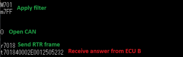 您需要通过再次打开 CAN 外设来应用此过滤器(例如:O 或 L)。应用此过滤器后,您应该能够发送一个 RTR 帧,并直接在终端中观察到响应: